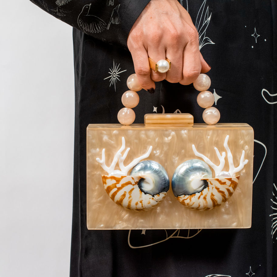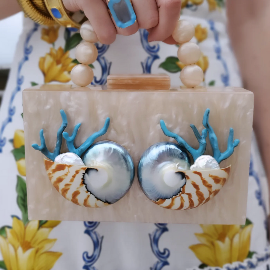 The Poppy is available in five colors of marbled acrylic: Tortoiseshell, White, Pink, Blue, or Champagne. The Poppy can be carried by its top handle, or wear it over the shoulder with a gold chain strap.